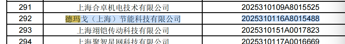 ومن بين الشركات المختارة شركة ديمارجو (شنغهاي) لتكنولوجيا توفير الطاقة المحدودة تم إدراجه بنجاح، مع رمز التسجيل 2025310116A8015488 .